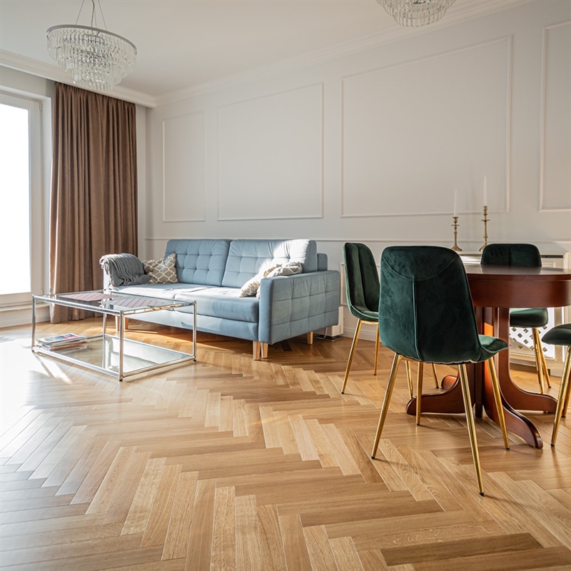 Natur sorteringen har en flot ensartet overflade med naturlige åretegninger og kun få små knaster, hvilket skaber et stilrent og roligt udtryk uden hvidsplint. Med sit klassiske sildebensmønster er dette gulv både stilfuldt og praktisk – perfekt til moderne boliger, hvor man ønsker et smukt og slidstærkt trægulv.